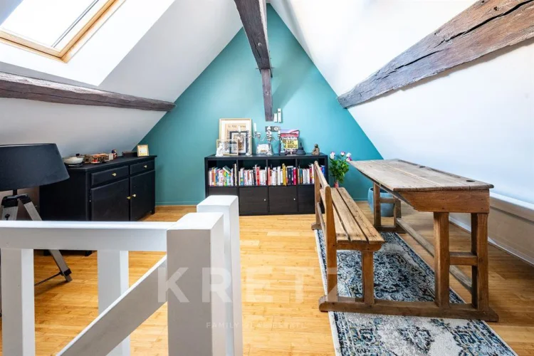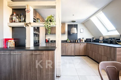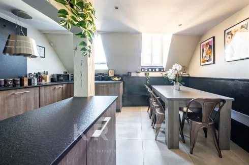 Entrance hall with built-in wardrobes, living room with views of the historic Saint Nicolas Tower and an east-west orientation, and a 19 m² equipped eat-in kitchen. Three bedrooms (possibility of 4), an office, a contemporary bathroom, a dressing room, storage, and a relaxation area on the mezzanine offer potential for additional development. A charming, bright apartment with beams and spacious interiors.