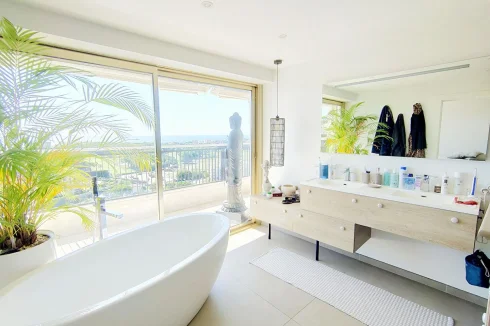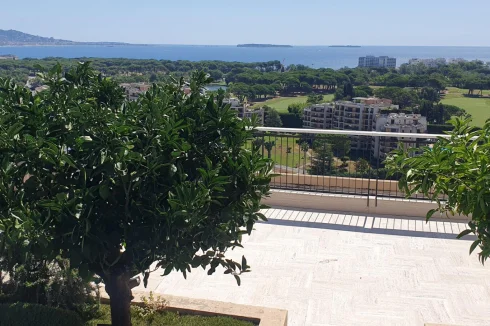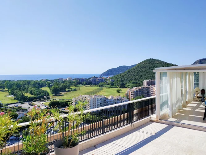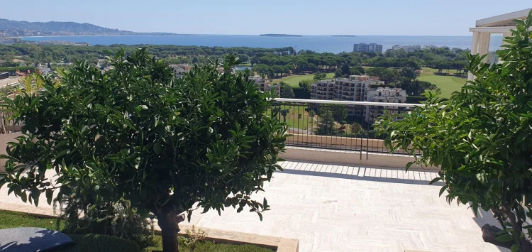 Located in a luxury residence with swimming pool and caretaker, a few steps from the shops, the golf course and the sea, this sumptuous rooftop villa offers a rare and privileged living environment.