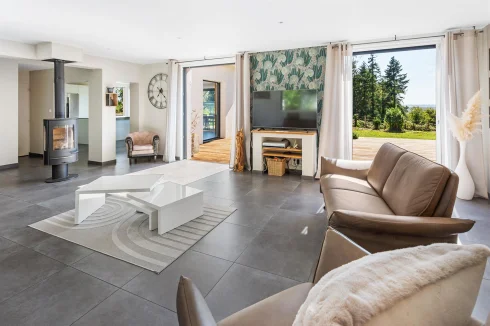 Bright living room : large living room bathed in light thanks to the sliding bay windows, enhanced by an adjustable stove in the center of the room.