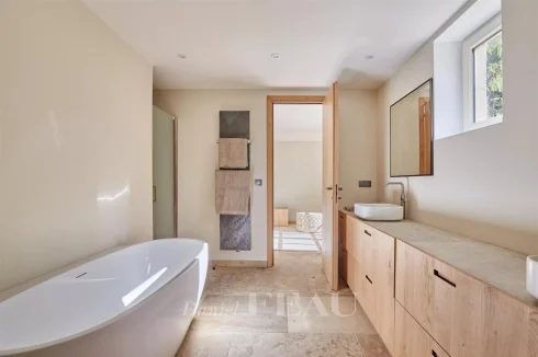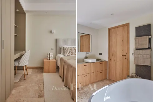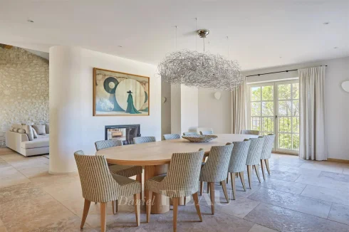 Accessed by means of a lift or a staircase, the upper floor comprises a spacious living/reception room bathed in sunshine and separated from a dining area by a double-facing fireplace, and a fully equipped kitchen with a pantry opening onto a covered terrace with a summer kitchen with a barbeque and a dishwasher, ideal for al-fresco dining.