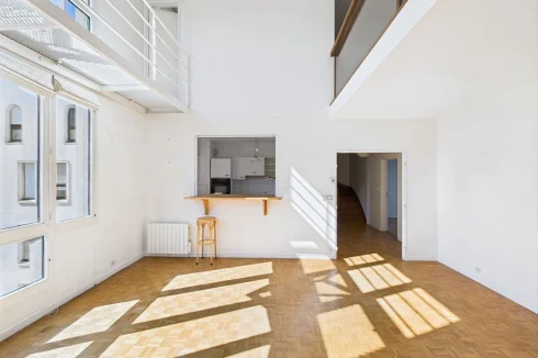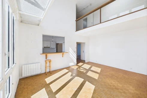 This 134m² apartment is perched on the top two floors (6th and 7th) of a luxury 1990s condominium, with a caretaker and very well-maintained. It boasts numerous assets: a cathedral-style living room with 5.5m ceiling height and partially unobstructed views of the Île de Puteaux and the Eiffel Tower, five bedrooms, three of which have terrace access, a large semi-open kitchen, no overlooked views, and a very pleasant quiet setting.