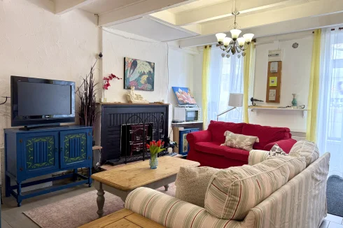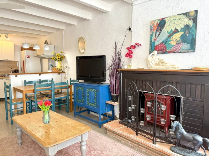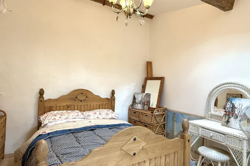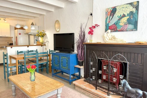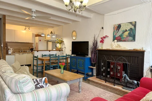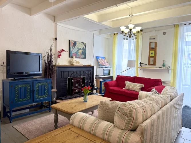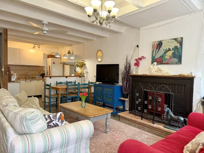The interior features a generously sized sitting/dining room with a charming feature fireplace, which opens onto the kitchen. Though compact, the kitchen is well planned and offers ample storage. A hallways leads to the ground floor shower room, a part-glazed door to the terrace, and a further doorway to the ground-floor double bedrooms with French doors opening onto the covered terrace - an ideal spot for alfresco dining. From here, steps descend to the delightful walled garden, creating a private and inviting outdoor retreat.