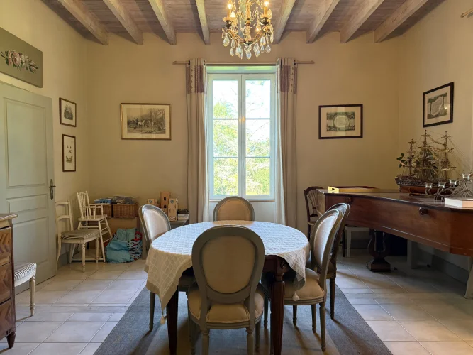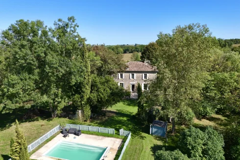 This elegant, charming residence, nestled in the heart of a peaceful green setting on a vast plot of more than 7,500 m2, is ideally located near Saint-Barthélemy d'Agenais, a short drive from Miramont de Guyenne and 20 minutes from the lovely bastide of Eymet. This 19th century mansion, with typical bourgeois architecture, is distinguished by its freestone construction with half-timbered elements, offering a perfect harmony between tradition and elegance.