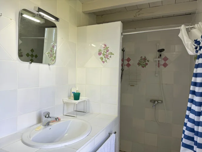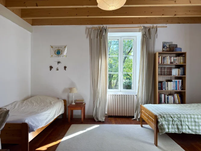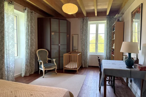 The upper floor, also 105m2, offers a large landing with mezzanine and cathedral ceiling, four spacious bedrooms with large windows, a dressing room, and a family bathroom equipped with a bathtub and a walk-in shower.