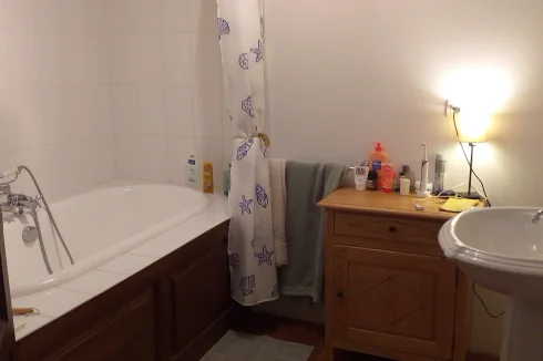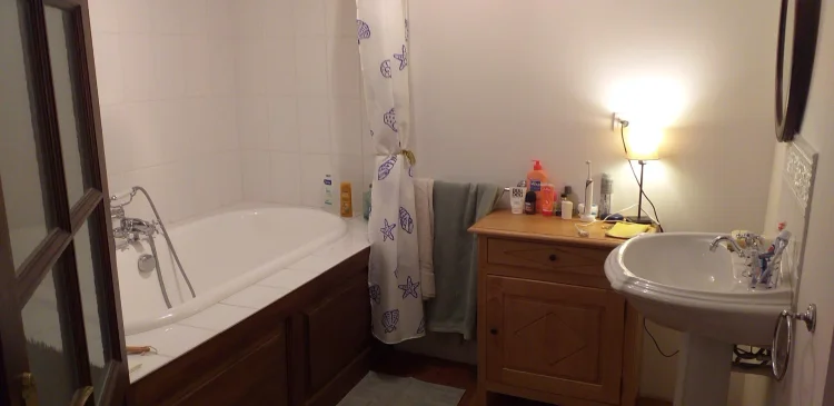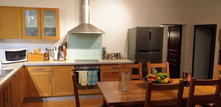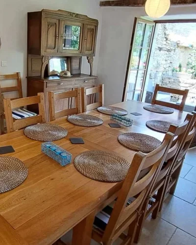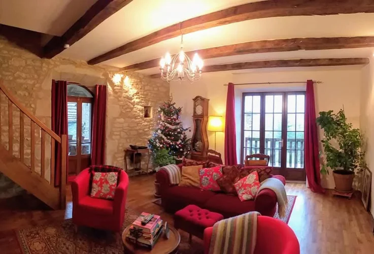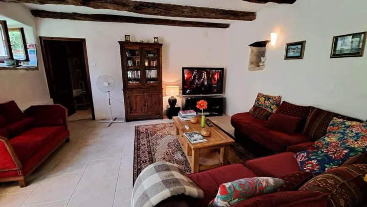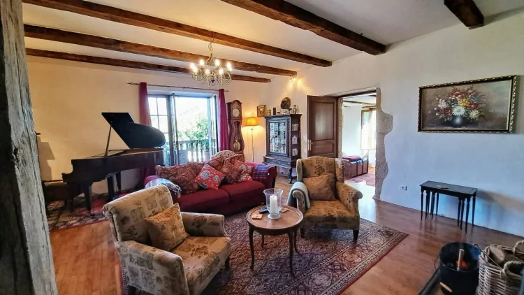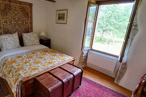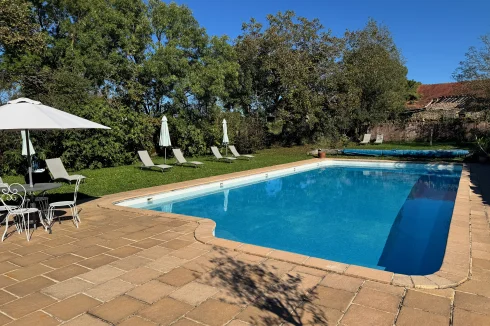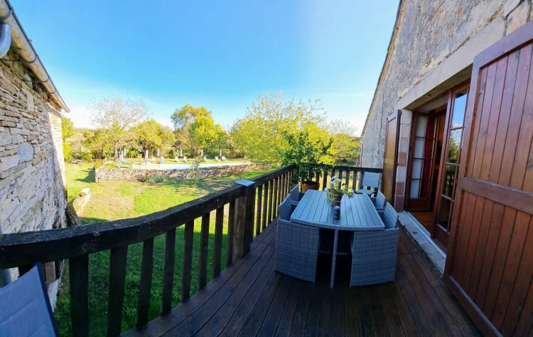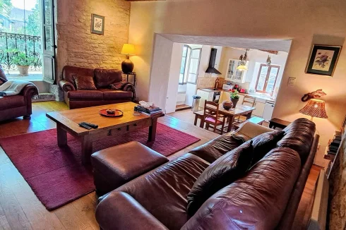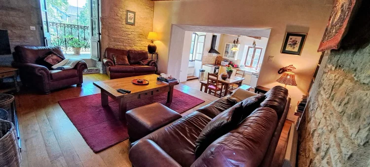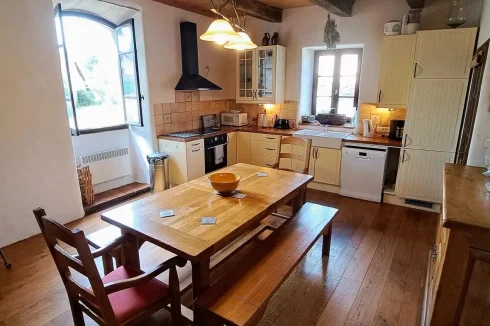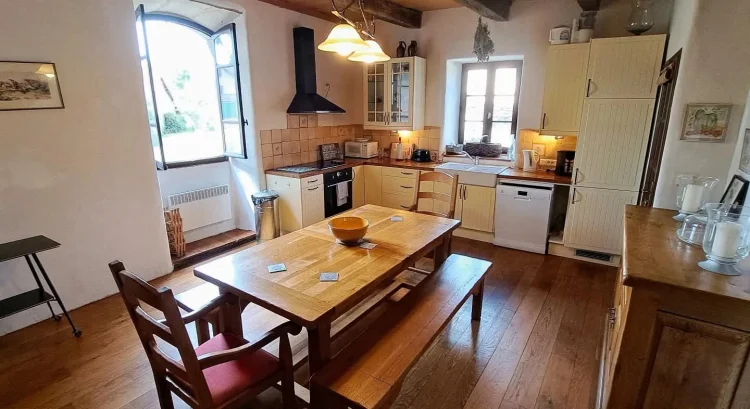 Unit 2 - (125m²) Fitted kitchen, original kitchen area (souillard), large living room with wood-burning stove and access to a large balcony with views of the gardens and swimming pool, 3 bedrooms and a shower room.