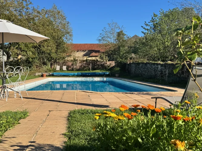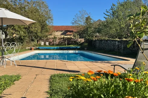 Swimming pool (15m x 7m) With steps at one end, this is a concrete pool and has a large terrace around the pool with flower borders Pool room at the entrance to the pool area.