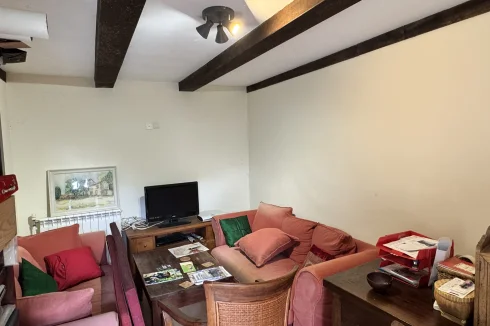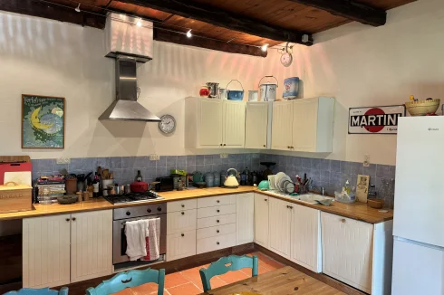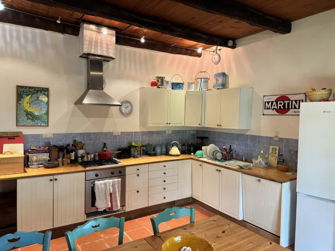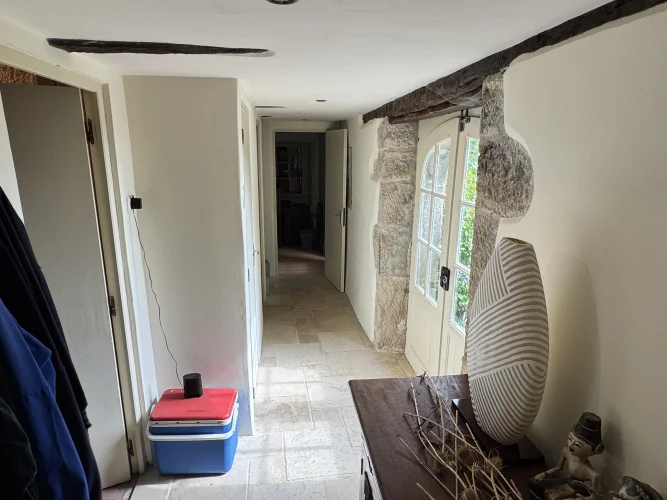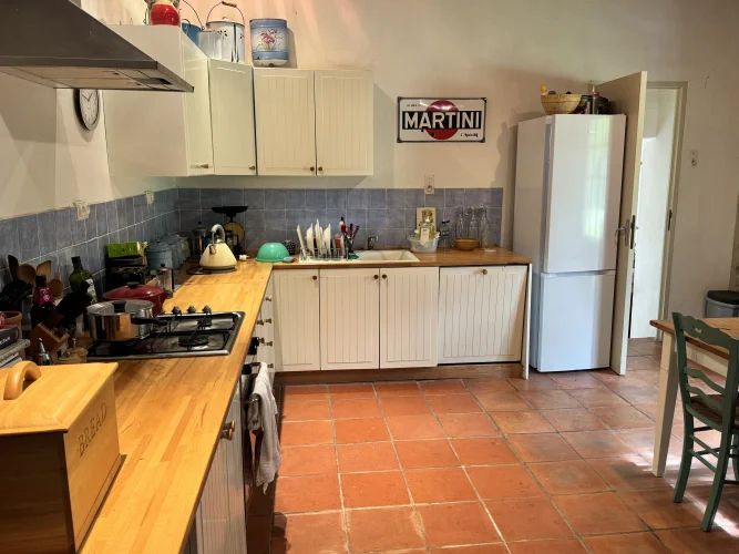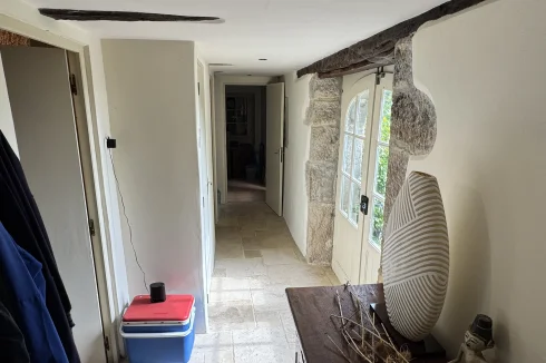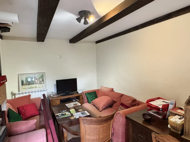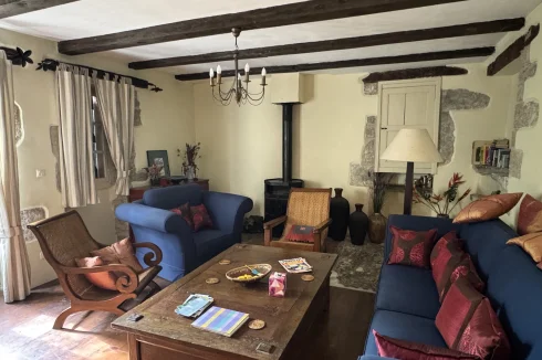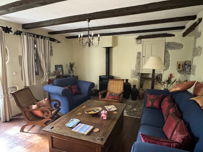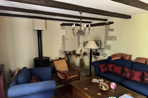 Steps lead both sides to the entrance hall and to the living room (25m2) with parquet and stone flooring, a wood burner, old evier and French doors to outside. Stairs to first floor.