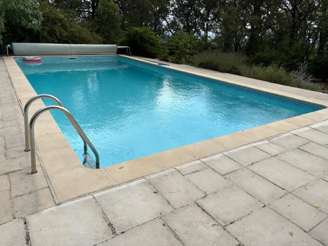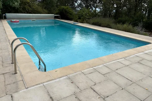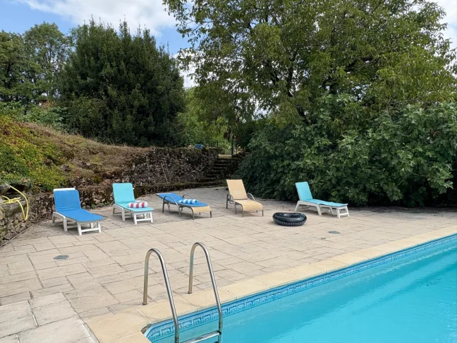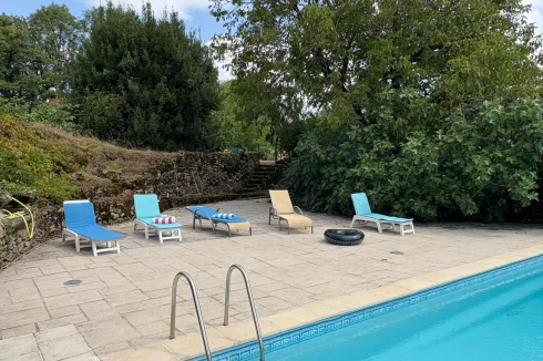 Steps down to a salt water swimming pool area with an 11m x 5m pool and its surrounding terraces. It is 3m deep and one end so ideal if you like diving!!