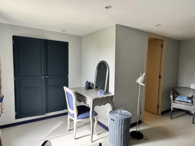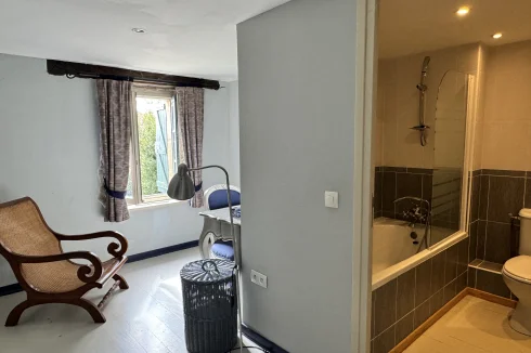 From the salon, stairs lead up to another landing and two bedroom suites. BEDROOM 3 suite has a dressing room (13m2) with radiator and downlighters and an en-suite bathroom with bath and shower over, WC and basin. Stairs up to the bedroom (9m2 min) with velux window in mansarded roof and radiator. BEDROOM 4 suite also has a dressing room (16m2) with an en-suite bathroom with bath and shower, WC and basin with partly tiled walls. Stairs up to the bedroom (10m2) with velux and radiator.